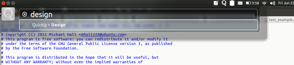 But the part I like the best about this app so far, is that it’s useful even when you’re not using it. Most of the time you spend developing a Quickly app is going to be in some other application, such as your code editor of choice, Glade or something. Thanks to Unity’s HUD, and the fact that it’s smart enough to check Indicator menus in addition to the focused application’s menus, you can call your Quickly commands any time, simply by tapping ‘Alt’ and the command you want to run. It’s like having Quickly integrated into all of your other tools.