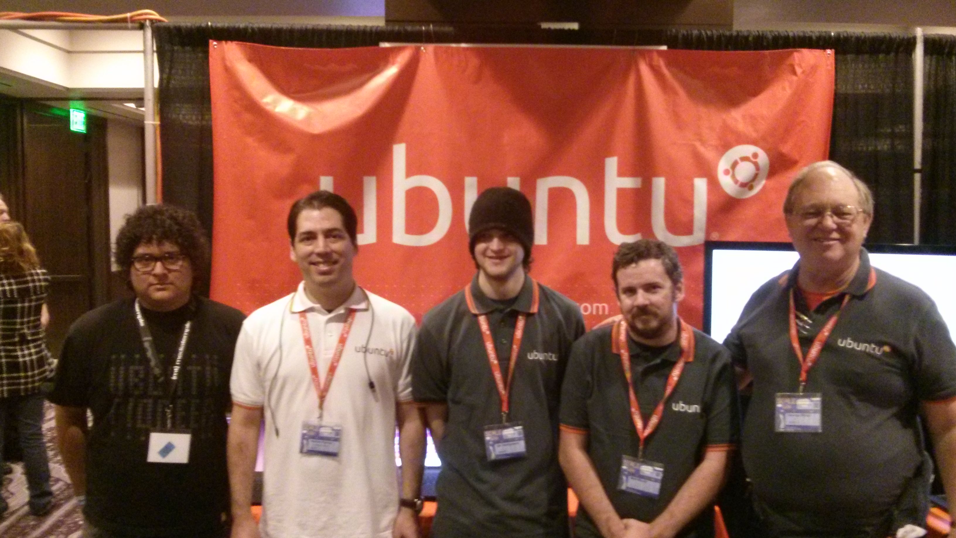 Our booth wouldn’t have happened without the efforts of Luis Caballero, Matt Mootz, Jose Antonio Rey, Nathan Haines, Ian Santopietro, George Mulak, and Daniel Gimpelevich, so thank you all so much! We also had great support from Carl Richell at System76 who let us borrow 3 of their incredible laptops running Ubuntu to show off our desktop, Canonical who loaned us 2 Nexus 4 phones running Ubuntu as well as one of the Orange Box cloud demonstration boxes, Michael Newsham from TierraTek who sent us a fanless PC and NAS, which we used to display a constantly-repeating video (from Canonical’s marketing team) showing the Ubuntu phone’s Scopes on a television monitor provided to us by Eäär Oden at Video Resources. Oh, and of course Stuart Langridge, who gave up his personal, first-edition Bq Ubuntu phone for the entire weekend so we could show it off at the booth.